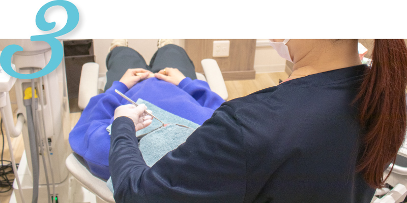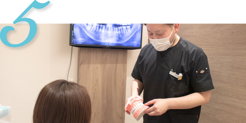 痛みがある箇所などの応急処置を行い、まずは現状を改善します。本格的な治療は次回以降、治療計画に基づき、お口全体の健康を考えながら進めてまいります。