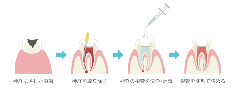 虫歯が重度に進行すると、歯の内部にある「根管(神経や血管の通り道)」にまで細菌感染が及びます。 この状態を放置すると、歯そのものだけでなく、歯を支えている骨にまで炎症が広がり、最悪の場合は抜歯が必要になることもあります。